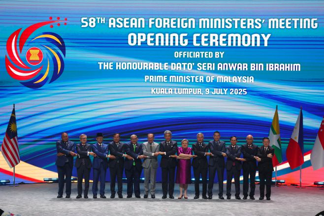9일(현지시간) 말레이시아 쿠알라룸푸르에서 제58차 아세안 외교장관 회의 개막식에서 기념사진을 촬영하고 있는 각국 장관들의 모습. 제일 왼쪽이 벤디토 도스 산토스 프레이타스 동티모르 외교장관이다/EPA 연합뉴스 |