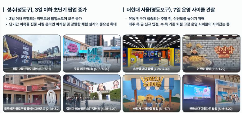 역시 가장 눈에 띄는 변화는 운영 기간의 단축이다. 2025년 상반기 팝업스토어의 평균 운영 기간은 17.9일로 지난해 25.1일에 비해 대폭 줄었다. 특히 성동구(13.9일)와 영등포구(15.3일) 등 핵심 상권일수록 짧고 강렬한 인상을 남기는 전략이 주를 이뤘다. 화제성을 극대화하고 임대료 부담을 줄이려는 목적으로 3일 이하 초단기 팝업을 여는 사례는 전년 대비 약 7배 증가했다.