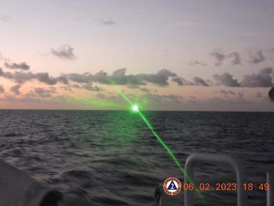 지난 2023년 2월 6일 분쟁 중인 남중국해에서 중국 해경선이 녹색 군사용 레이저 광선을 비추고 있다. 사진은 필리핀 연안경비대가 제공했다. |