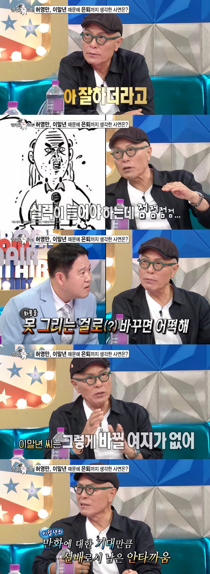 영상에서 MC 김구라는 "허영만이 52년 만화가 인생의 은퇴를 고민한 순간이 있다더라"고 물었다. 이에 허영만은 "은퇴를 고민했던 게 몇 년 전이다. 이말년(침착맨)이 '일요신문'에 만화를 연재하는데 잘하더라. 근데 사람이 하나 시작했으면 점점 실력이 늘어야 하는데 점점 떨어졌다"고 돌직구를 날렸다.