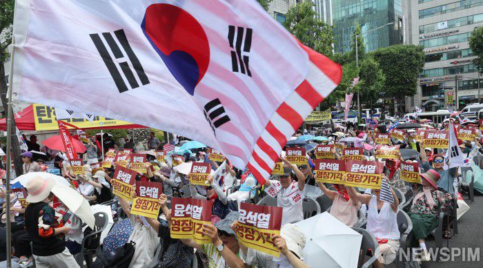 [서울=뉴스핌] 김학선 기자 = 윤석열 전 대통령 재구속 여부를 결정하는 구속 전 피의자심문(영장실질심사)이 열린 9일 서울중앙지법 인근에서 윤 전 대통령 지지자들이 영장기각을 촉구하며 집회를 하고 있다. 2025.07.09 yooksa@newspim.com