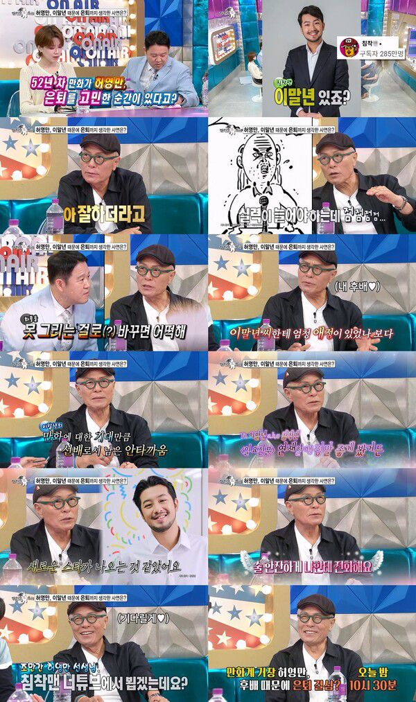 데뷔 52년 차 만화가 허영만의 후배 이말년을 향한 애정과 조언은 오늘(9일) 수요일 밤 10시 30분에 방송되는 '라디오스타'의 '호로록! 식객로드' 특집을 통해 확인할 수 있다.
