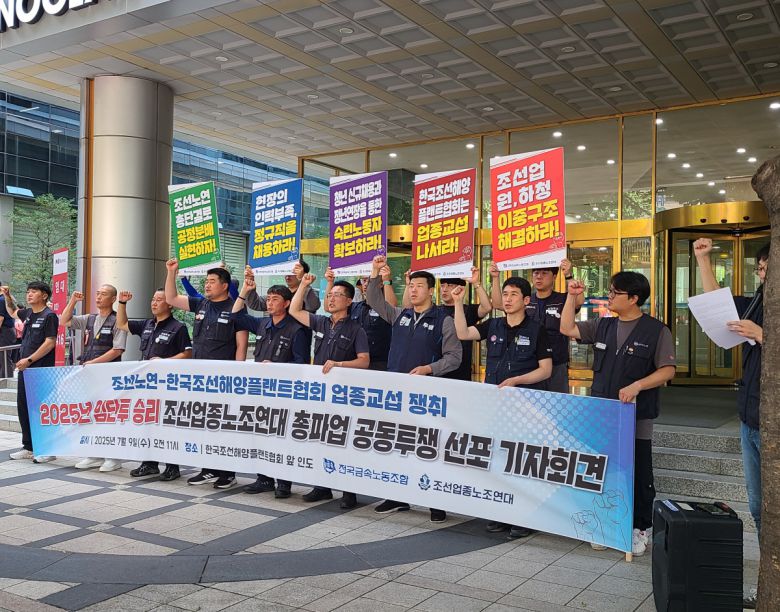 또 “조선업 전반의 구조적인 문제를 풀기 위해 한국조선해양플랜트협회가 나서 조선업종 전체의 공동 교섭을 시작해야 한다”며 “협회는 조선산업을 대표하는 조직인 만큼, 더 이상 무책임하게 뒷짐 지고 있지 말고 산업의 지속가능성과 노동자의 생존을 위한 교섭 테이블에 즉시 나와야 한다”고 주장했다.