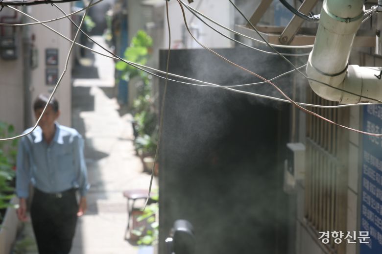 기록적인 폭염이 계속되고 있는 9일 서울 종로구 쪽방촌에 쿨링포그가 가동되고 있다. 한수빈 기자 |