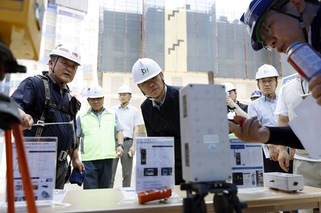 황상하 서울주택도시공사 사장이 고덕강일 3단지에서 활용하고 있는 스마트 안전 관리 시스템을 살펴보고 있다. /서울주택도시공사