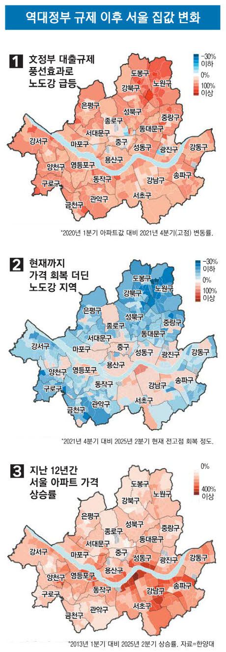 문재인 정부 출범 이후 초반엔 규제지역의 확대 등으로 억제된 강남 중심지역보다는 주변의 가격 상승세가 두드러지는 양상을 보인다. 하지만 해당 기간 서울 아파트 시장의 평균적인 상승세는 약 49%에 달했다. 이어지는 초저금리로 인한 급등기(2020년 1분기~2021년 4분기), 15억원 초과 주택의 주택담보대출 금지 및 다주택자에 대한 추가적인 중과 등 다양한 수요 억제책들이 도입된 이후 풍선효과로 노도강 내 몇몇 행정동에서는 80%를 넘어서는 급등세가 발생했다(지도 1). 이 기간 강남지역의 상승세는 상대적으로 낮았으나, 압구정동이나 성수동의 상승세는 이어져갔다.