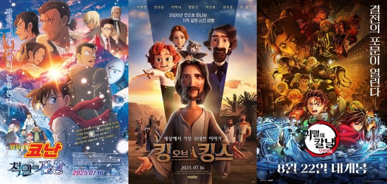 명탐정 코난: 척안의 잔상·킹 오브 킹스·귀멸의 칼날: 무한성편 포스터. CJ ENM·모팩스튜디오(킹 오브 킹스) 제공 |