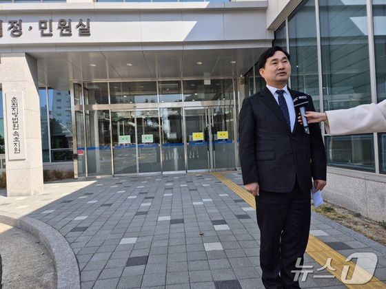 김도균 더불어민주당 강원도당위원장이 지난 3월 21일 오전 춘천지법 속초지원에서 열린 공직선거법·정치자금법 위반 사건 1심 선고 공판에서 피선거권이 유지되는 벌금 80만 원을 선고 받은 후 법정을 나와 취재진과 인터뷰를 하고 있다. (자료사진)/뉴스1 DB |
