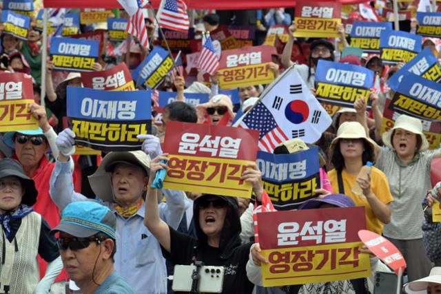 불볕 더위를 막기 위해 양산·팔토시 등으로 중무장한 윤 전 대통령 지지자들은 영장 기각을 확신했다. 김모(55)씨는 "특검의 '망신주기용 영장'은 기각돼야 마땅하다"고 강조했다. 50대 다른 지지자도 "성실히 조사를 받는 분(윤 전 대통령)에게 무슨 도주 우려가 있다고 영장을 청구하느냐"며 "애초에 이건 이재명의 정치 보복에 불과하다"고 목소리를 높였다.