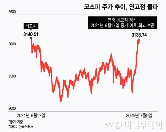 코스피지수는 9일 전 거래일 대비 18.79포인트(0.60%) 오른 3133.74에 장을 마감했다. 종가 기준 지난 3일 기록한 3116.27을 뛰어 넘는 수치며 2021년 9월17일 기록한 (종가) 3140.51 이후 3년9개월여만 최고 수준이다.