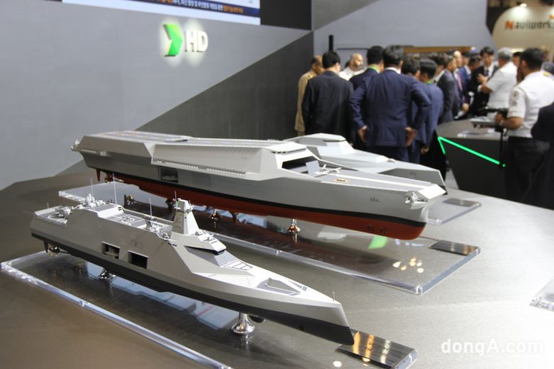 HD현대중공업이 부산 국제해양방위산업전(MADEX)에서 공개한 유·무인 전력 지휘함 콘셉트 모형. 최재호 기자 cjh1225@donga.com |