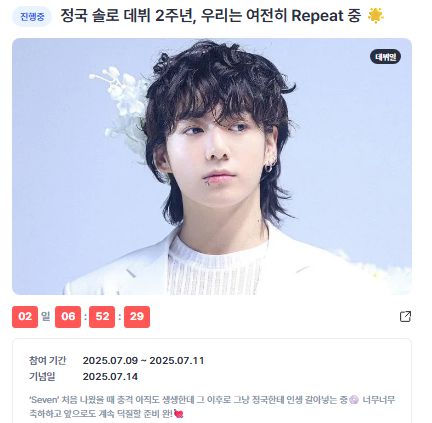 한편, 정국의 솔로 데뷔 2주년을 기념하는 팬 이벤트가 디시트렌드 기념 탭에서 진행 중이다. 해당 이벤트는 "정국 솔로 데뷔 2주년, 우리는 여전히 Repeat 중 "이라는 제목과 함께 운영되며, 참여 기간은 9일부터 오는 11일까지, 기념일은 정국의 솔로 데뷔일인 7월 14일이다.