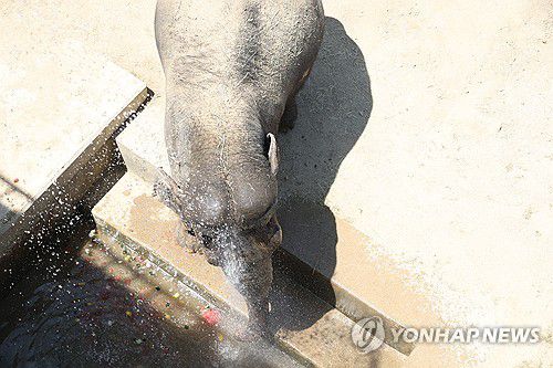 물로 열기 식히는 코끼리(대구=연합뉴스) 박세진 기자 = 폭염이 이어진 9일 대구 달성공원에서 코끼리가 물을 맞으면서 더위를 식히고 있다. 달성공원 측은 해당 코끼리가 1969년도에 태어났다고 밝혔다. 2025.7.9 psjpsj@yna.co.kr