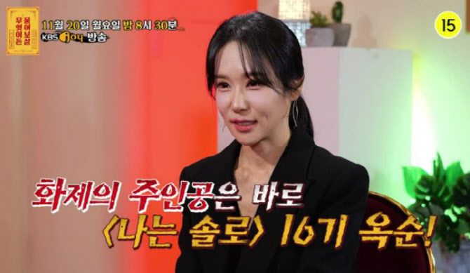 16기 옥순은 ‘나는 솔로’ 돌싱 특집에 출연해 얼굴을 알린 바 있다. 이후 ‘무엇이든 물어보살’ 등에 출연했다.