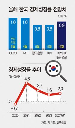 9일 국내외 주요 기관들에 따르면 올해 한국의 경제성장률 전망치는 0.8~1.0% 수준이다. 국제통화기금(IMF)과 경제협력개발기구(OECD)는 성장률 전망치를 1.0%로 예상했고, 한국은행과 한국개발연구원(KDI)은 0.8%로 내다봤다. 해외 주요 투자은행(IB) 8곳은 0.9%(평균)를 제시했다.
