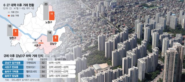 주택담보대출을 6억 원 이하로 제한하는 6·27 대책 시행 이후 천정부지로 치솟던 반포와 압구정 등 강남 ‘톱 티어’ 단지들의 거래 가격이 급락하고 있다. 반면 목동과 상계동 등 재건축을 추진 중인 아파트 단지의 가격은 6·27 대책 이후에도 상승세를 기록하고 있어 대조를 보이는 상황이다. 전문가들은 자금 조달 문턱이 높아진 상급지의 조정 국면이 이어지고 상대적으로 가격이 저렴하지만 재건축 기대감이 높은 단지의 상승 흐름은 이어질 것으로 전망했다.