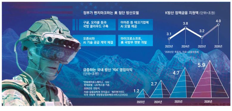 글로벌 방산업계의 인공지능(AI) 활용이 가속화하는 가운데 정부가 우리 군이 보유한 대규모 데이터를 방위산업 기업들에 개방해 AI무기체계 개발에 활용하는 방안을 추진한다. 국방·방산 클라우드 시스템을 구축해 최첨단 무기를 개발하는 미국식 모델을 벤치마킹하겠다는 것이다. 민관 합작 방산펀드를 조성해 K방산에 대한 투자를 확 늘려 산업 경쟁력 강화를 뒷받침한다.