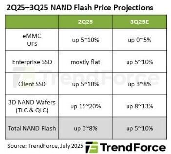 2025년 2분기·3분기 낸드 플래시 가격. /트렌드포스 제공 |