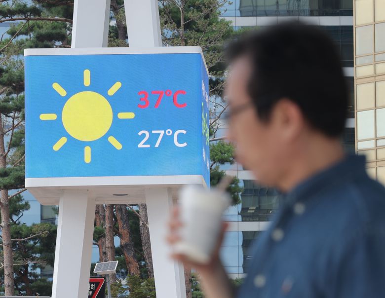 폭염이 계속되는 9일 서울 송파구 잠실역 사거리에 설치된 날씨 전광판 앞으로 한 시민이 시원한 음료수를 마시며 지나가고 있다.연합뉴스 |