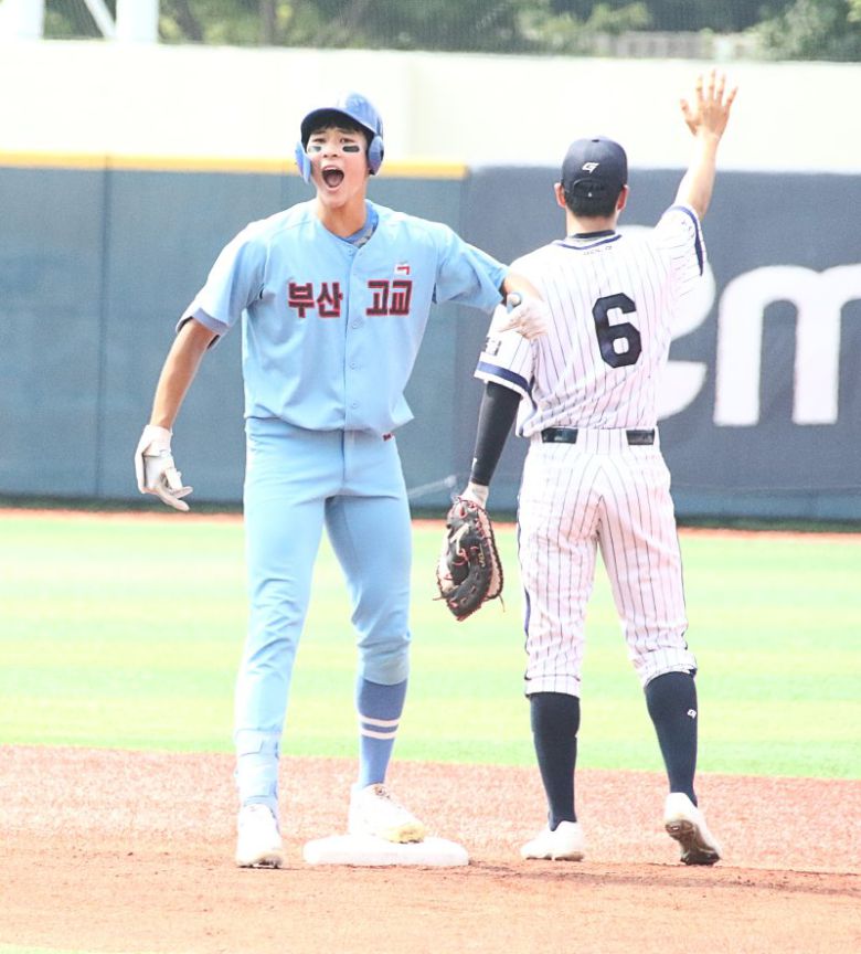 부산고 2학년 하현승이 지난 8일 목동야구장에서 펼쳐진 서울고전에서 선제 2타점 2루타를 때려낸 직후 2루에서 포효하고 있다. |