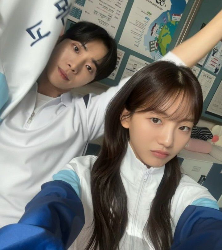 또한 조이현과 함께 장난스러운 셀카를 찍으며 현장 분위기를 따뜻하게 이끌었다. 특히 교실에서 사물함과 게시판을 배경으로 함께한 체육복 셀카에서는 풋풋한 고등학생 커플의 모습이 보여준다.