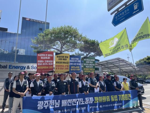 전국민주노동조합총연맹 전국건설노동조합 광주전남전기지부 근로자들은 9일 한전 광주전남지역본부 앞에서 집회를 열고 "한국전력공사 배전 협력업체는 일방적인 임금 삭감을 철회하라"고 요구했다.