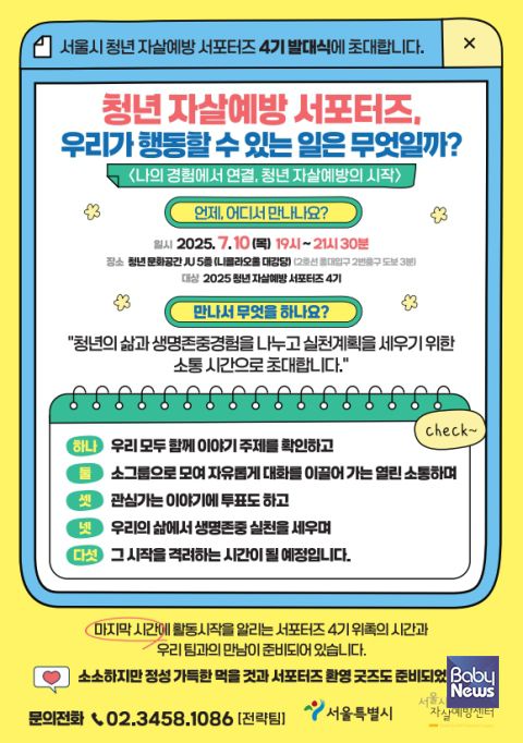 서울시자살예방센터(센터장 최성영)는 오는 10일 청년문화공간JU 동교동 니콜라오홀에서 '2025년 청년 자살예방 서포터즈 4기 발대식’을 개최한다고 9일 밝혔다.