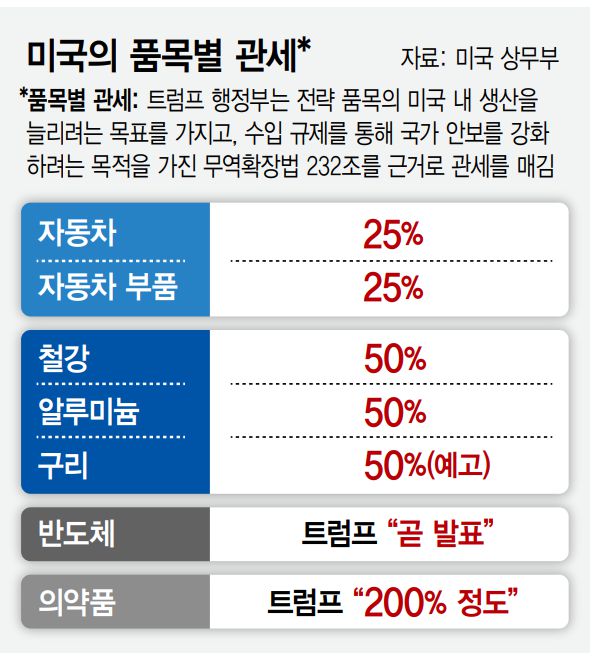 도널드 트럼프 미국 대통령이 구리·의약품·반도체에 대한 품목 관세를 곧 발표하겠다고 밝히면서 대미 수출에 먹구름이 더 짙어졌다. 한국 등에 8월1일부터 상호관세를 부과한다고 위협하는 서한을 보내고 하루 만에 ‘관세 전쟁’을 더 난폭하게 몰아가는 것으로, 그 계획대로라면 한국 대미 수출의 50% 가까이가 고율의 품목 관세 대상이 된다.