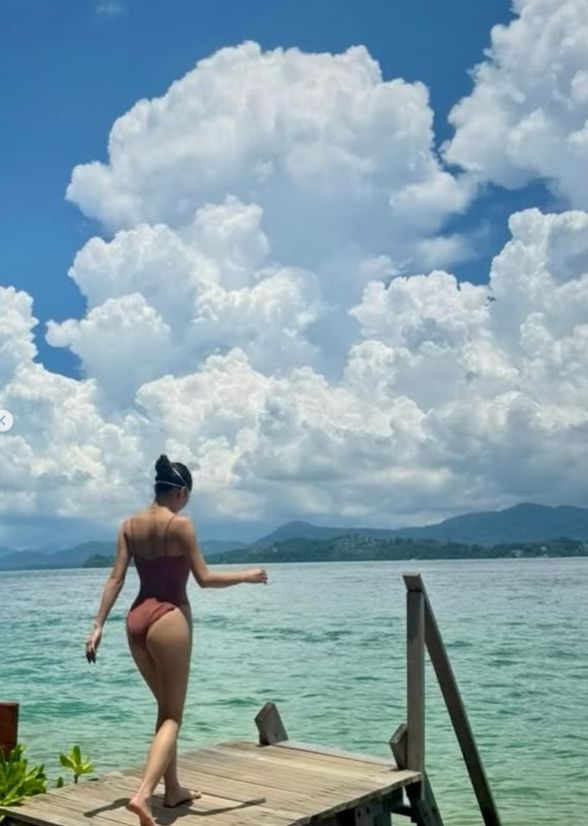 공개된 사진 속 화사는 매혹적인 붉은색 수영복을 입고 푸른 바다와 하늘을 배경으로 여유로운 한때를 보내는 모습이다.