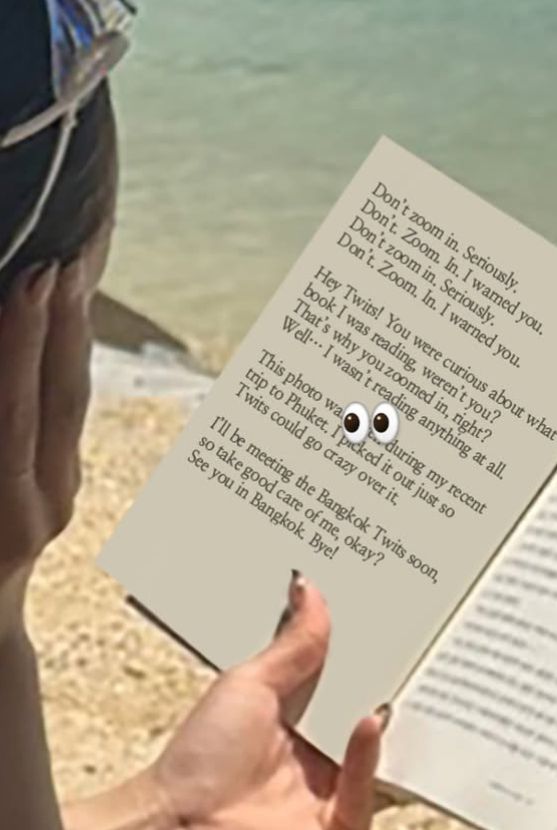 마지막으로 “이 사진은 제가 최근 푸켓 여행 중에 찍은 거예요. 트윗들이 정말 미쳐 날뛰게 하려고 일부러 골랐어요. 곧 방콕 트윗들을 만날 거예요, 그러니 저를 잘 부탁해요, 알겠죠? 방콕에서 봐요. 안녕!”이라며 방콕 콘서트에 대한 기대감을 유발했다.
