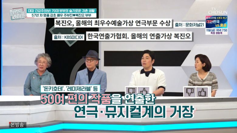 9일 방송된 TV조선 '퍼펙트라이프'에는 배우 주부진과 남편 복진오가 게스트로 출연했다.