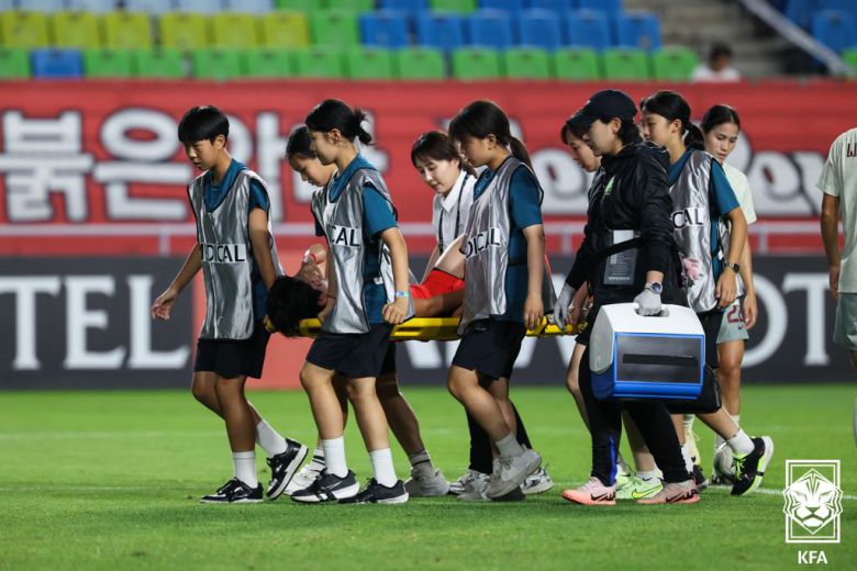 흐름을 가져오려던 한국에 변수가 발생했다. 전반 22분 전유경이 상대와의 경합 이후 허벅지 뒤쪽, 햄스트링에 통증을 호소하며 쓰러진 것이다. 의료진은 전유경이 더 이상 뛸 수 없다고 판단, 결국 22분 만에 경기 첫 번째 교체카드를 사용했다. 실려나온 전유경 대신 김민지가 투입됐다.