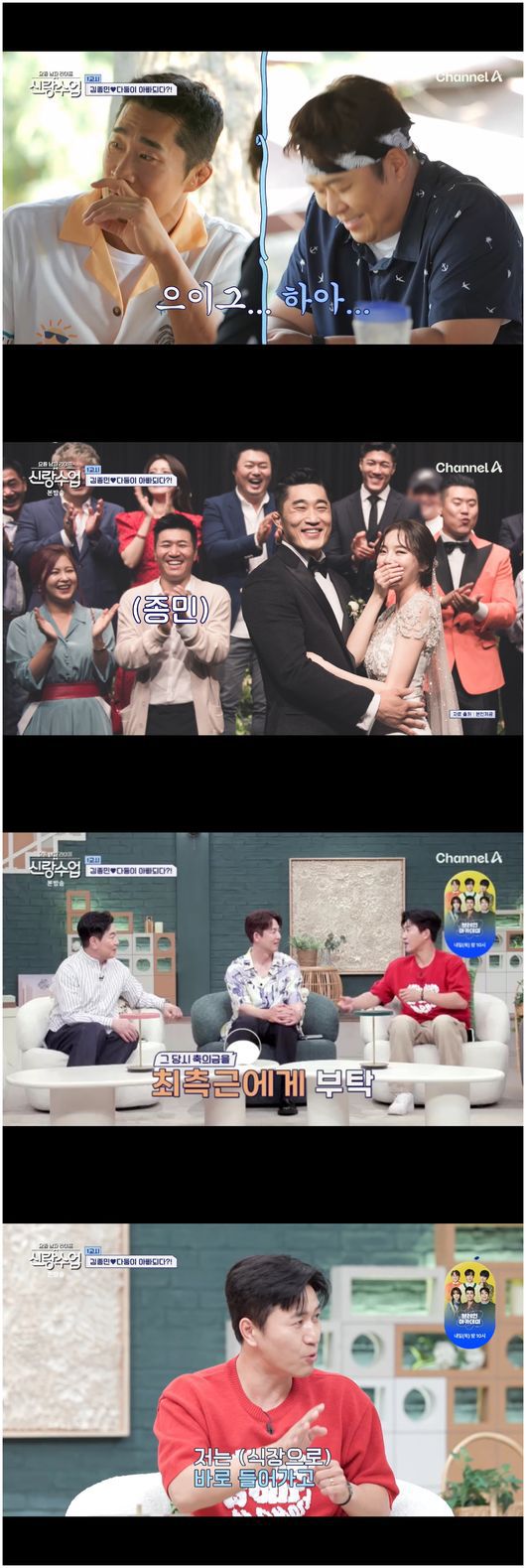 9일 방영한 채널A 예능 '요즘 남자 라이프 신랑수업'(이하 '신랑수업')에서는 다둥이 아빠 김동현과 문세윤이 김종민에게 육아 팁과 함께 몸 만들기에 나섰다.
