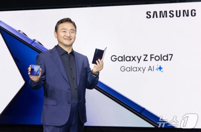 왼손에 갤럭시Z플립7을 들고있는 노태문 삼성전자 DX부문장 직무대행(사장)(삼성전자 제공)/뉴스1 |
