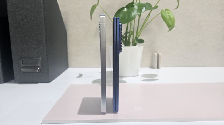 바 형태 스마트폰인 갤럭시 S25 울트라(왼쪽)와 신형 폴더블폰 Z폴드7 두께 비교. 노도현 기자 |
