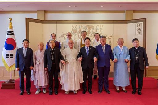 이재명 대통령이 9일 서울 용산 대통령실 청사에서 종교계 지도자들과 오찬 간담회를 갖기에 앞서 참석자들과 손을 맞잡고 기념촬영을 하고 있다. 앞줄 왼쪽부터 김종생 한국기독교교회협의회 총무, 천태종 총무원장 덕수 스님, 이용훈 한국천주교주교회의 의장주교, 조계종 총무원장 진우 스님, 이 대통령, 김종혁 한국교회총연합회 대표회장, 최종수 성균관장, 정순택 천주교 서울대교구 교구장 대주교. 뒷줄 왼쪽부터 박인준 천도교 교령, 태고종 총무원장 상진 스님, 나상호 원불교 교정원장, 김령하 한국민족종교협의회 회장.