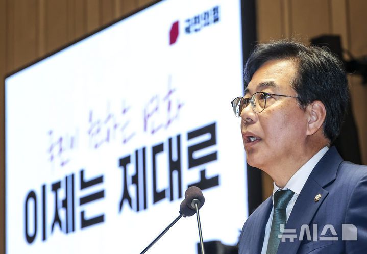 [서울=뉴시스] 고승민 기자 = 국민의힘 송언석 비상대책위원장이 9일 서울 여의도 국회에서 열린 긴급의원총회에서 발언하고 있다.  2025.07.09. kkssmm99@newsis.com