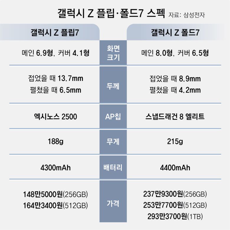 갤럭시 Z 폴드7과 갤럭시 Z 플립7은 이달 25일부터 국내를 비롯해 전 세계에 순차 출시된다. 국내 사전 판매는 15일부터 21일까지 7일간 진행된다. 갤럭시 Z 폴드7의 가격은 256GB(기가바이트) 저장공간 기준 237만9300원, 512GB 253만7700원이다. 갤럭시 Z 플립7은 256GB 148만5000원, 512GB 164만3400원으로 책정됐다.