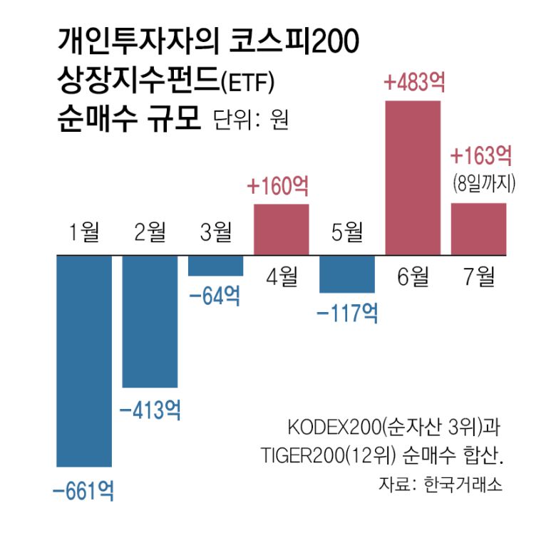 한국거래소에 따르면 개인투자자는 지난달 KODEX200과 TIGER200을 483억 원 순매수했다. 이달 들어선 6거래일 동안 163억 원 순매수했다. 이는 올 1∼5월 중 4월(160억 원 순매수)을 제외하고는 계속 순매도했던 것과는 확연히 다른 모습이다.