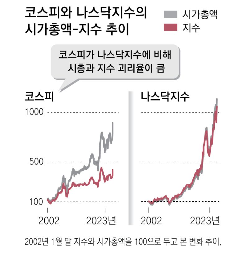 미국 나스닥과 비교하면 더욱 두드러진다. 동아일보가 삼성증권에 의뢰해 2002년 1월 말 코스피와 나스닥의 시총과 지수를 100으로 두고 분석한 결과 코스피는 이달 4일 기준 시총이 886.7로 8.8배로 증가했는데도 지수는 410으로 4.1배로 느는 데 그쳤다. 반면 나스닥은 시총 1089.3, 지수 1065.2로 비슷하게 10배가량으로 증가했다.