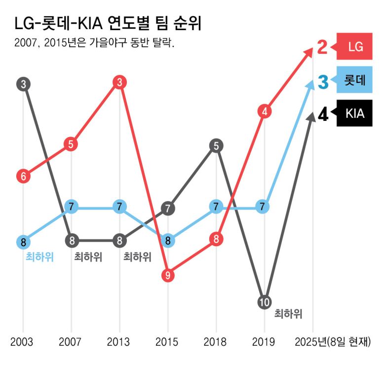 이로부터 10년이 지난 올해 분위기가 극적으로 바뀌었다. 엘롯기 동맹은 ‘앞에서’ 2∼4위에 이름을 올리고 있다. 8일 현재 LG 2위, 롯데 3위, KIA 4위다. 이대로 정규시즌이 끝나면 LG, 롯데, KIA 세 팀이 나란히 포스트시즌 무대를 밟는 사상 초유의 장면이 연출된다. 1982년 프로야구 출범 후 지난해까지 43년 동안에는 엘롯기 동맹 세 팀이 ‘가을 야구’ 무대에 동반 진출한 적이 한 번도 없었다.