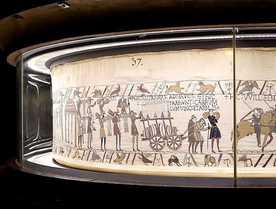 11세기 작품인 바이외 태피스트리는 길이 70m에 이르는 직물 자수품이다. 정복왕 윌리엄 1세의 잉글랜드 정복 과정을 설화 형식으로 묘사했다. 58개의 장면 속에 인물 626명과 말 202마리가 등장하는 이 작품은 1066년 헤이스팅스 전투에서 앵글로색슨족이 도망치는 장면으로 마무리된다. 당대 유럽 생활상을 세밀하게 묘사해 미술사적 가치가 큰 문화유산으로 평가받으며, 2007년 유네스코 세계기록유산으로도 등재됐다.