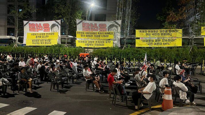 집회 사회자는 “이 사태를 뒤집을 수 있는 건 다시 12월3일 계엄이 선포됐던 겨울로 돌아가는 것뿐”이라고 하거나 “이 판을 뒤집어서 이재명을 끌어내려야 한다”며 참여자들을 북돋웠지만 상당수는 허망한 표정으로 의자에 몸을 기대어 있거나 주변 기둥을 잡고 고개를 떨궜다. 사회자가 “맥아리없게 있지 말라”고 다그치자 힘없이 “네”하는 대답이 간간히 들려왔다. 윤 전 대통령이 재구속된 후 법원에 진입하거나 집회 현장을 벗어나 도를 넘는 과격한 행동을 벌이는 이들은 눈에 띄지 않았다.