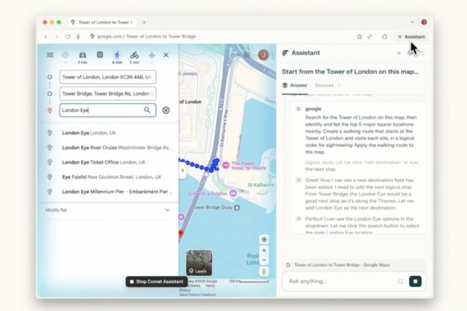 퍼플렉시티가 10일(현지시간) 출시한 웹브라우저 '코멧'으로 구글 지도에 접속해 '코멧 어시스턴트'를 실행한 모습./사진=퍼플렉시티 유튜브 갈무리 |
