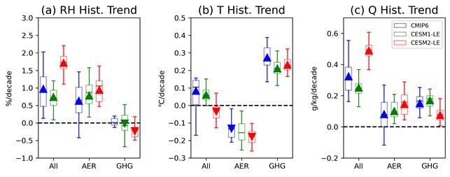 온실가스와 에어로졸이 상대습도(RH), 온도(T), 특정습도(Q)에 미치는 영향 비교. |