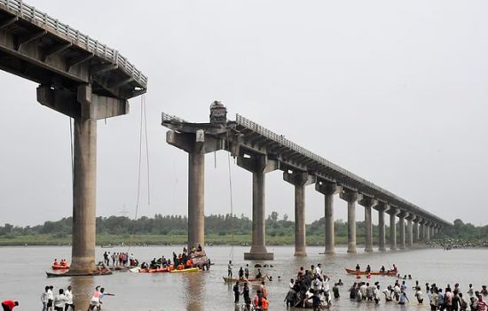 9일(현지시간) 인도 PTI통신에 따르면 아난드와 바도다라를 잇는 갬브히라-무즈퍼 다리는 이날 오전 교통량이 가장 많은 출근 시간대에 무너졌다. 이번 사고는 다리 중 상판 일부가 붕괴하면서 발생했다.