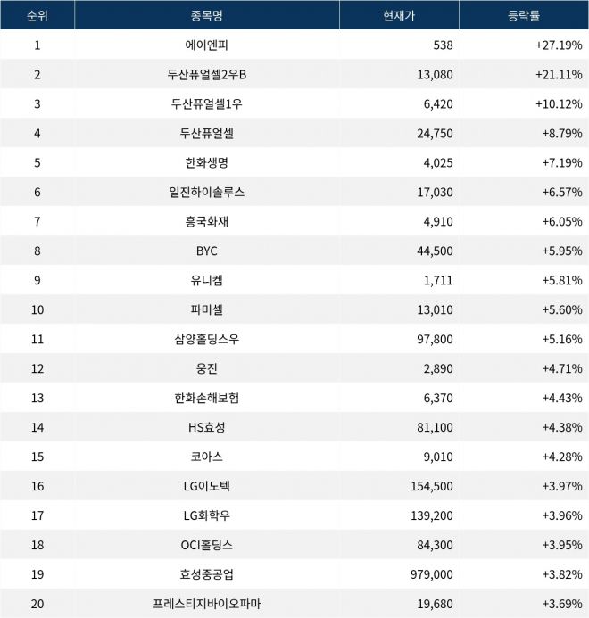 6위 일진하이솔루스(271940)는 현재가 17,030원으로 6.57% 상승 중이다. 7위 흥국화재(000540)는 현재가 4,910원으로 6.05% 상승 중이다. 8위 BYC(001460)는 현재가 44,500원으로 5.95% 상승 중이다. 9위 유니켐(011330)은 현재가 1,711원으로 5.81% 상승 중이다. 10위 파미셀(005690)은 현재가 13,010원으로 5.60% 상승 중이다.