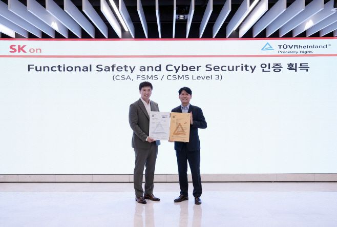10일 SK온은 글로벌 시험·인증 전문기관 TUV 라인란드로부터 사이버 보안 인증(CSA), 기능 안전 관리 체계(FSMS, Functional Safety Management System) 레벨3 인증 등 총 두 건의 국제 인증을 획득했다고 밝혔다.