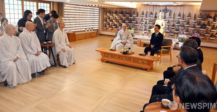[서울=뉴스핌] 청사 사진기자단 = 김민석 국무총리가 10일 오전 서울 종로구 조계종 조계사 관음전에서 조계종 총무원장(진우 스님) 등 불교계 지도자들을 예방했다. 김민석 국무총리가 진우 스님과 대화하고 하고 있다. 이날 진우 스님을 비롯해 기획실장인 법오 스님, 사회 부장인 진경 스님, 문화부장인 혜공 스님, 사서실장인 일감 스님이 참석했다. 2025.07.10 photo@newspim.com
