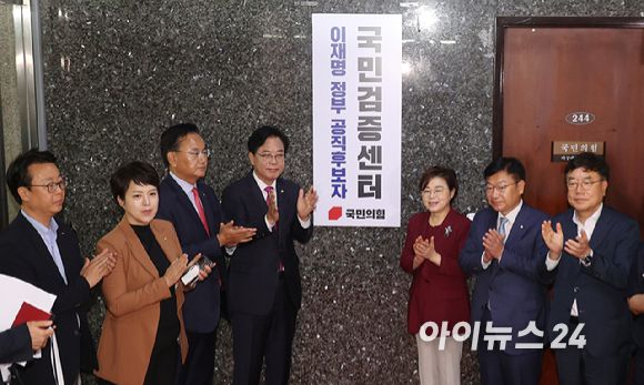 국민의힘 송언석 비상대책위원장 겸 원내대표와 이재명 정부 공직후보자 국민검증센터 단장을 맡은 유상범 의원 등 소속 의원들이 8일 국회에서 열린 '이재명 정부 공직후보자 국민검증센터' 현판식에 참석해 박수를 치고 있다. [사진=곽영래 기자] |